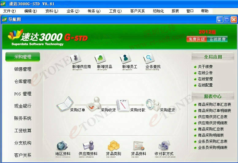 《速達(dá)3000 G-STD 》是一款集進(jìn)銷存、財(cái)務(wù)、POS、CRM為一體的集成化企業(yè)信息管理系統(tǒng)。軟件界面簡(jiǎn)潔,功能完善,有效幫助企業(yè)處理日常經(jīng)營(yíng)管理業(yè)務(wù),協(xié)調(diào)業(yè)務(wù)流轉(zhuǎn)過(guò)程。系統(tǒng)融入新 一代全局應(yīng)用技術(shù),支持互聯(lián)網(wǎng)/局域網(wǎng)多用戶應(yīng)用,支持異地多機(jī)構(gòu)、多店面、多倉(cāng)庫(kù)遠(yuǎn)程應(yīng)用,支持?jǐn)?shù)據(jù)實(shí)時(shí)同步管理和移動(dòng)辦公,安全穩(wěn)定、高速,易實(shí)施維護(hù),特別適合中小企業(yè)使用 。