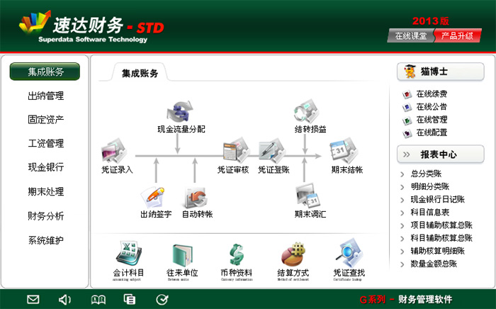 《速達財務G-STD》完全符合國家現行會計制度標準。功能強大、易學易用。產品集財務管理、出納管理、工資管理、固定資產管理、自定義報表于一體。特別適合中小企業使用。