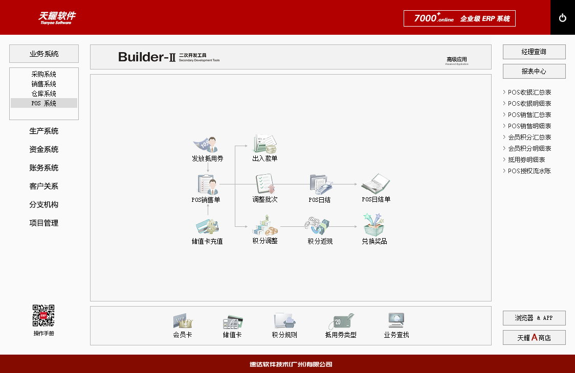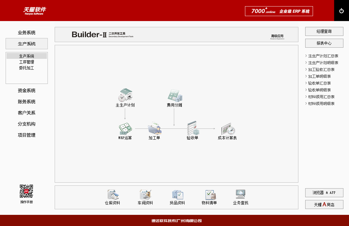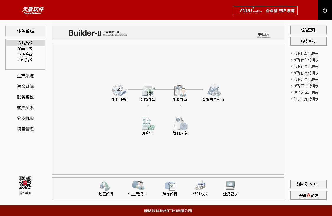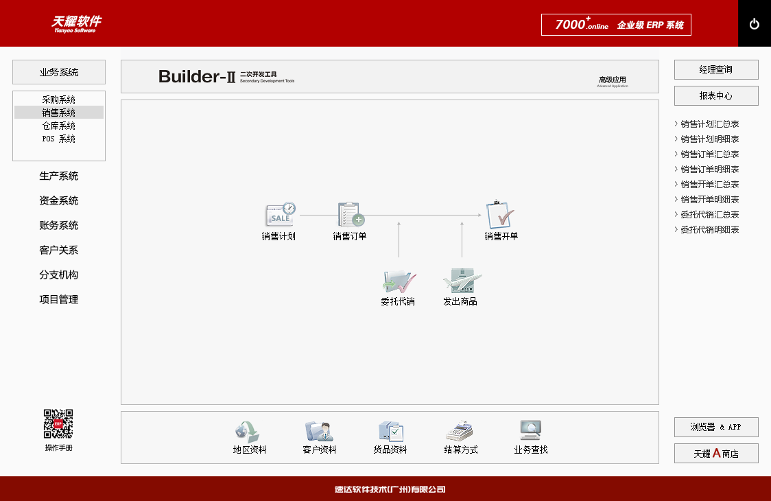 《天耀7000+.online PRO》是速達軟件公司最新推出的企業級ERP系統。系統支持云部署和桌面服務器部署及APP部署, 并科學地融入Builder-II二次研發工具,滿足企業管理的個性化需求,大大提升了應用效率和安全性。將企業供應鏈、POS、財務、生產、客戶關系、項目管理集成于一體并科學的結合“云”技術,系統同時支持IE瀏覽器、WIN桌面端、APP移動應用等多種應用模式。真正滿足企業管理的個性化需求,全面提升企業綜合管理水平。